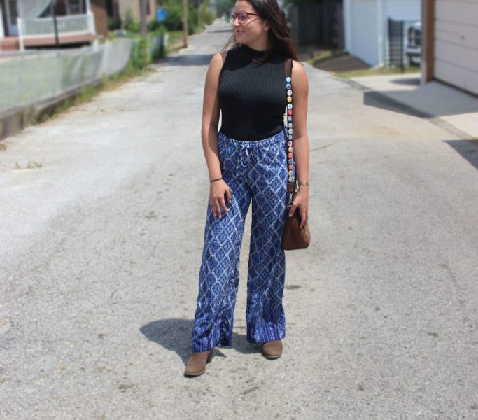 The patterned pants that I am wearing in this look are one of the many colorful pants that I own. These types of pants are a necessity for me, because they are incredibly comfortable, as well as very stylish. With the crazy patterns and colors, they make anyone sure to pop out of a crowd! These specific pants are high-waisted and make my legs look a lot longer than they truly are. I love them because they add more chaos to my outfit, and the colors are beautifully mismatched with my bag.
