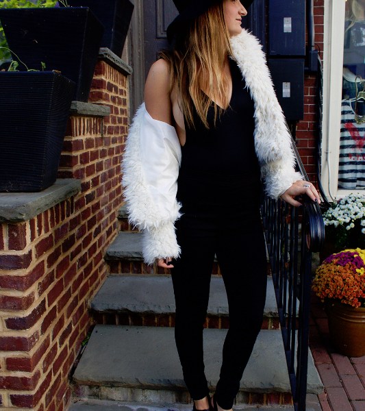 A fluffy white jacket is perfect for this incoming cool air, it adds texture and a pop of color to the Fashionista’s sleek all-black look. You can never go wrong with chunky black platforms give a little height to this petite Fashionista, and the black adds to her head to toe color theme.