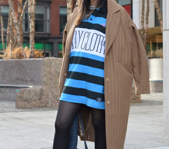 I’m a sucker for a great coat, and this is a great coat. Oversize, masculine and wool, all my favorite characteristics that I look for in a coat. Adding the laying of striped shirts give a very street wear vibe taken in an art student direction. I love how so many aspects of her outfit are kept oversize, because oversize means cozy, and cozy is number one in my books. Speaking of books, a backpack is the best way to go around. Whether it be for school or traveling. A Kanken backpack may seem small, but the canvas material allows one to pack as many objects inside while still retaining the rectangle shape. What screams “art school student” more than a Kanken? It’s a classic, and Fjällräven works to create environmentally friendly and sustainable items, which is a very important mission for a brand to have.