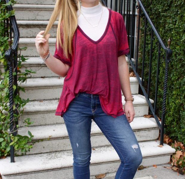 This outfit is so much more than jeans and a T-shirt. It’s casual but fashionable, which is why I chose to feature it. This would be a perfect outfit to wear to class or to a study date. This Fashionista rocks a vibrant berry colored T-shirt from Free People, layered over a white turtleneck. Even though the shirt is short sleeved, the color makes it a good piece for the holiday season. On a colder day, this would be perfect layered under a cool utility jacket. This Fashionista and I both agree that the best part about this outfit is that amazing turtleneck. The knitted texture helps this outfit feel very wintry, and it’s so adorable with her high ponytail.