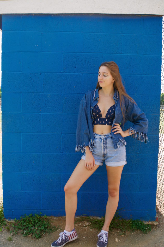 Denim is one of my favorite things to work with, so this look incorporates a lot of denim and blue colors. I have on some vintage denim shorts and a blue crop top. I am also wearing an oversized denim button-up shirt that I thrifted and distressed. To finish the look off, I am wearing some American flag-printed sneakers.