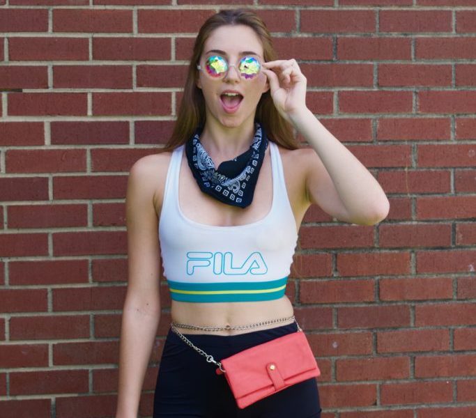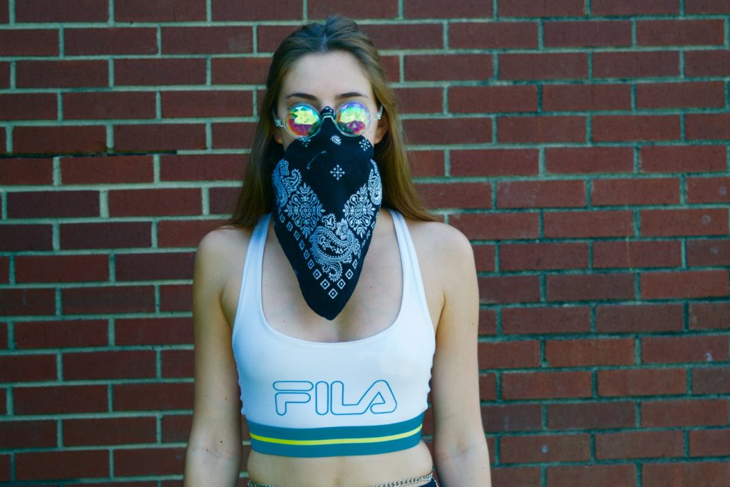 Going for a sporty look is not only cute but really practical! It’s summer, it’s hot, you will sweat. That’s why this is one of my favorite looks. I am wearing a Fila sports bra and spandex shorts. To finish this look off I wore a fanny pack, a bandana, and a pair of kaleidoscope glasses. Another tip: Fanny packs are perfect for carrying your essentials all day at the festival.
