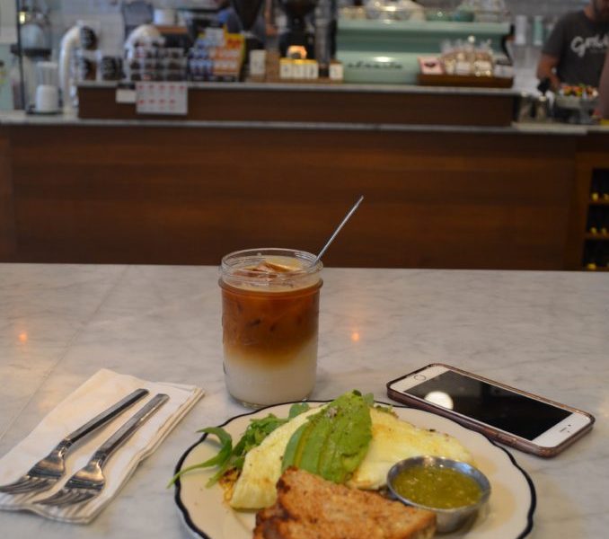 There is also a wide variety of drinks from coffee in mason jars to a juice bar. I got the goddess gringo horchata. If you are a coffee lover, you’ll enjoy this drink because of its unique rice and cinnamon flavors that escalate the drink so much. This cafe serves breakfast, lunch, and dinner as well! I got the iron man omelet which consisted of arugula, avocado, and brussels sprouts in egg whites. After eating my healthy breakfast, I decided to treat myself to a rainbow slice of cake. It was truly magical and tasted delicious!
