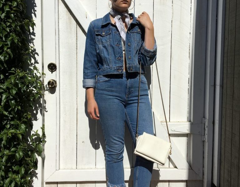 1—Same tone denim. No one can ever go wrong with a denim cropped jacket and a pair of statement jeans. When you do the same tone of denim, it is fun to add in colors. White is an eye-catching color to add with same tone denim. It keeps it chic without being too overwhelming for the eye.