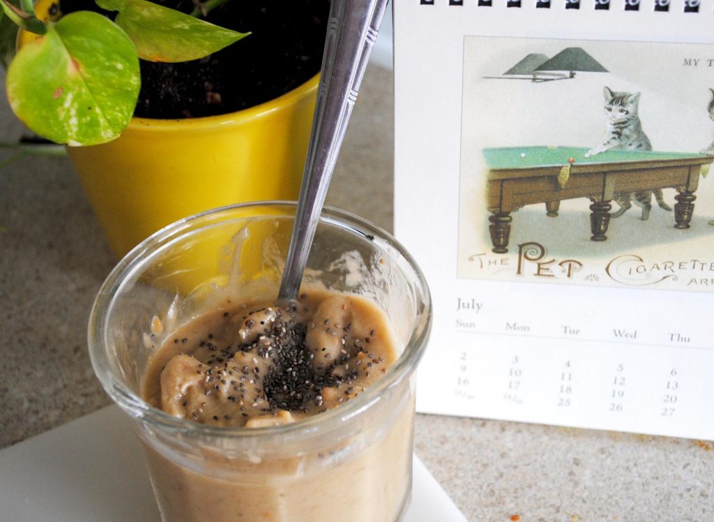 First, you need to cut the bananas into thin slices and store them overnight in the freezer. Then the next day, throw the slices into a blender or food processor with two spoonfuls of peanut butter. I like to add cinnamon, but you can add whatever you want. Once blended, the consistency is thick and creamy like ice cream. Sometimes, I’ll add chia seeds over top for extra goodness. It’ll absolutely satisfy your sweet tooth—without the added sugar!