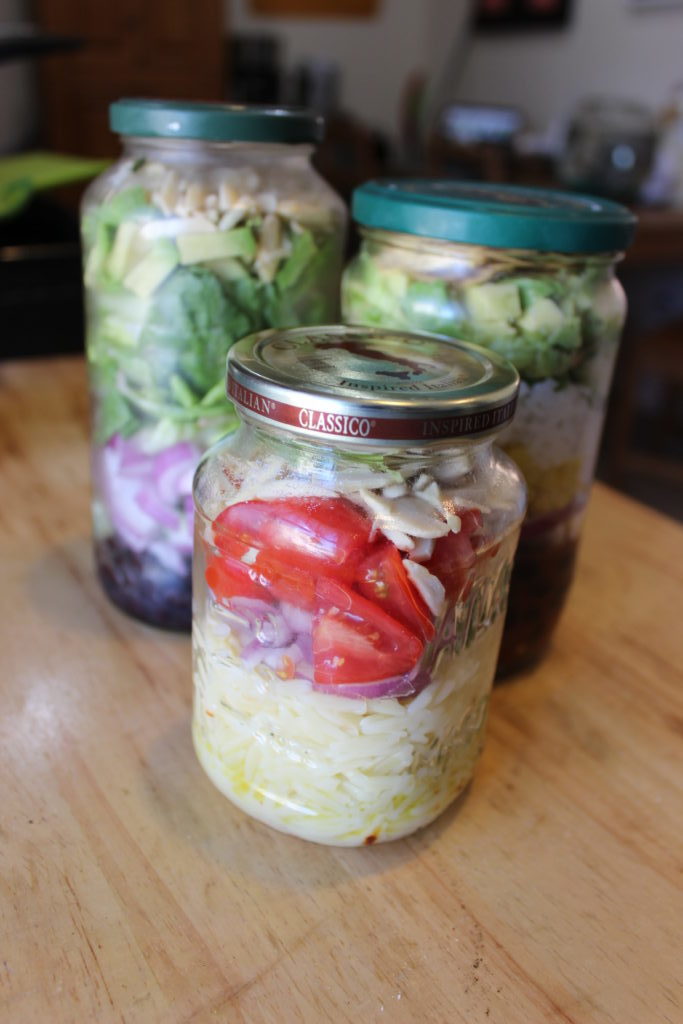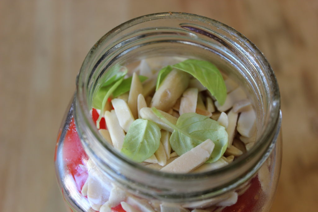 I love this recipe because it is filling, cost-efficient, simple, and super easy yet still delicious. In the bottom of a jar, place some lemon juice mixed with extra virgin olive oil. If you are like me and love spice, throw in some red chili flakes as well. Then, add some cooled orzo, chopped tomatoes, red onions, and toasted almonds. To top it all off, add some parmesan and baby basil and you are good to go!