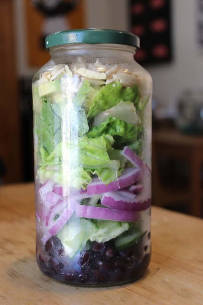 This one features some black beans, red onions, sliced cucumbers, and avocado with some romaine lettuce and toasted almonds to top it all off. This is my go-to salad, and it stays so fresh in the jar so I can make it on the weekend and still eat it on Monday. Simply empty out the contents in an empty container at work, add some dressing of your choice, toss it up, and you are ready to munch!