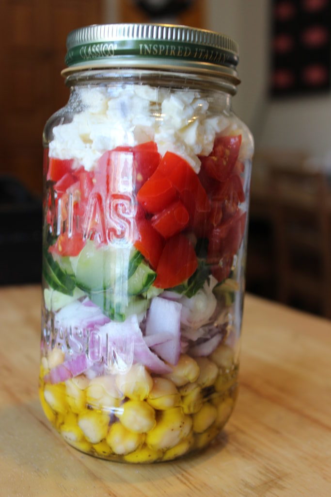 This one includes all of my favorite aspects of a fiesta or classic “Taco Tuesday” in one healthy salad! In a jar, place some salsa at the bottom and layer in some black beans, corn, rice (or quinoa if you want a healthier option), romaine lettuce, avocado, and some tortilla chips for extra crunch!