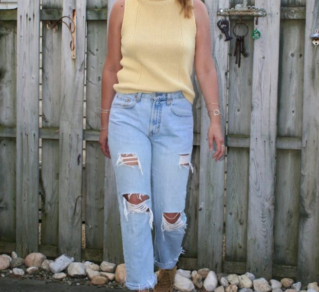 With this look, I wanted to incorporate one of my favorite pieces I buy time and time again —a sleeveless turtleneck. I was able to find this sunny yellow top at a local thrift store, and it has been an instant staple ever since. To balance the vibrant hue of the sweater, I chose a simple bottom. Light wash, distressed denim jeans are my go-to bottoms for the summertime, whether they are pants or cut-offs. By pairing them with a camel gladiator heel, it dresses up the outfit just the right amount.