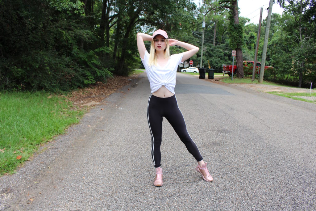 This next look pays homage to the athleisure trend that is seen everywhere right now. Pair a loose white T-shirt (tie it for extra casualness) with black striped leggings. Add some millennial pink sneakers and baseball cap to take this look to the next level. Adding the pops of pink is a fun, fresh way to tie it all together.