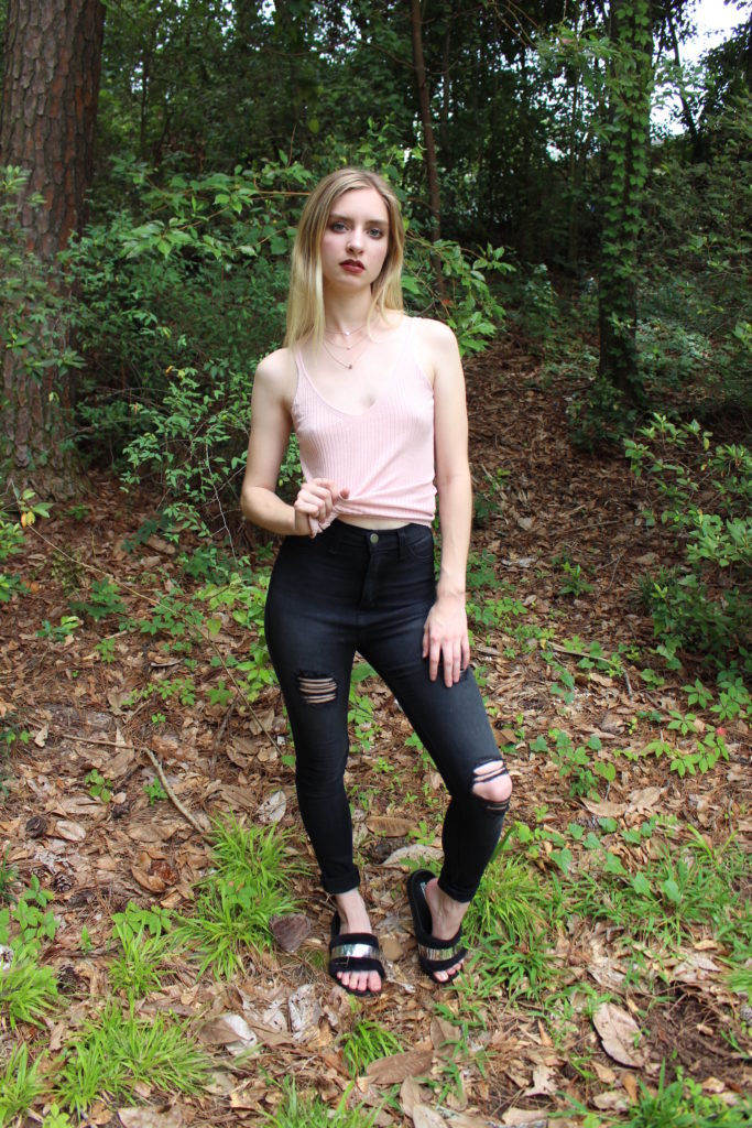 The third look is the most simple and casual—great for hanging out with friends on a summer day. This Fashionista is wearing distressed high-waisted jeans with a classic ribbed tank. This tank is perfect for beating the summer heat. Add a pair of slides for an effortless feel and rose gold layered necklaces for a delicate touch.