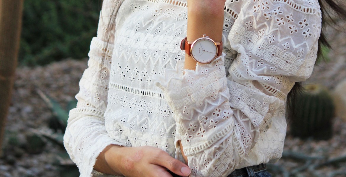 Add some flash to an otherwise laid-back California look with a pop of metal. Courtney Dahl, Pepperdine University, Class of 2019, paired her Nixon Arrow ($200) with a vintage-inspired floral dress and fisherman cap for a casual and cute fit just perfect for brunching.
