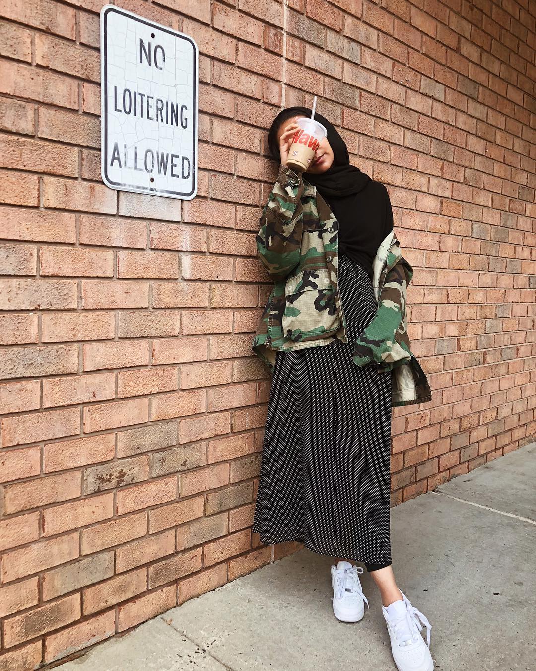 Get the look: Urban Outfitters Vintage Cinched Camo Jacket ($79), Asos Design Button Through Midi Skirt ($48), Nike Air Force 1 ’07 ($90)