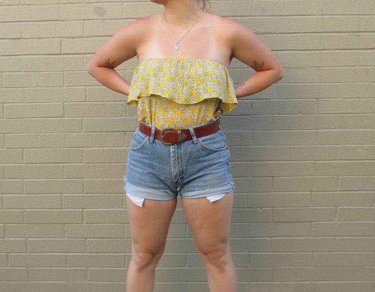 This Fashionista played with color without embracing every color of the rainbow. She stands out in the crowd in this bright yellow off-the-shoulder top that matches her yellow nails perfectly. These shoulder-baring tops are one of the hottest trends of the summer. She pairs the look with a plain brown belt and simple denim shorts to create a casual and comfy vibe. On her feet, she wears simple white canvas shoes that are perfect for walking the 10-block parade that happened before meeting at the center of downtown where the main events of the parade were set up.