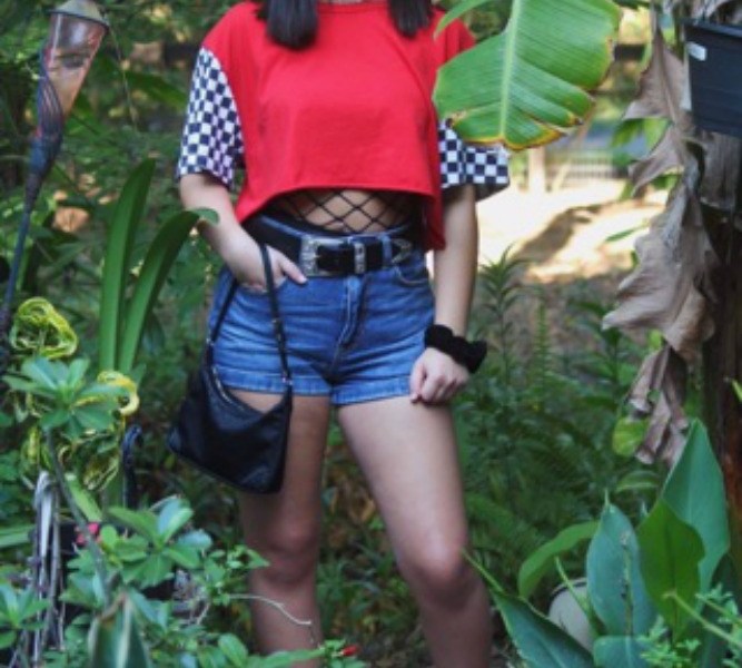 1—Edgy chic. Starting off with the edgy portion of this look, I layered an oversize cropped top over a netted bralette and high-waisted shorts. For the past year or so, red has been a staple in my color palette. It gives the perfect edge to any outfit and pairs beautifully with black. The fishnet bralette that lies underneath is such a simple and fun way to add excitement to any crop top. Adding black and silver accessories, such as my purse, belt, and choker, give the outfit a more minimal, chic vibe.
