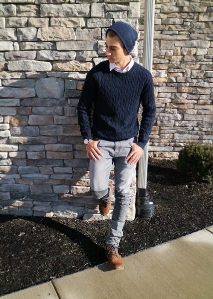 This handsome Fashionisto is wearing a navy blue knit sweater from Uniqlo with a white collared shirt underneath and grey skinny jeans with patch detailing on both knees. The beanie covers up his bedhead, and give the outfit a more laid-back look. His Chelsea boots from H&M and minimalistic watch add a smart casual vibe that pulls the look together. In total, this outfit only took him five minutes to pick out, and he says that the chicks dig it. Overall, the outfit not only looks neat and put together, but it is also extremely comfortable and easy to wear.
