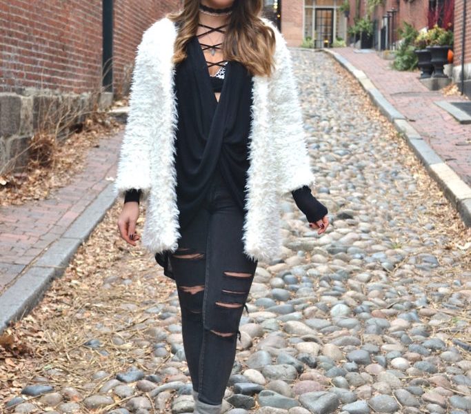 This Fashionista layered a lace bralette underneath a deep lace-up long sleeve shirt. On top of that she layered a white faux fur jacket that really added a statement to her look. With that she paired a pair of black ripped jeans and plain black booties that really went well with her aesthetic.