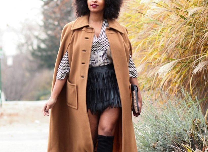 Don’t toss your skirt to the back of your closet until warmer weather comes back around just yet! This Fashionista makes wearing a leather fringe skirt in the winter look easy as she pairs it with a fashionable black and white patterned blouse and suede boots. To add the right pop of color, and to keep the neutral color palette consistent, she utilized her camel colored coat, which also ties the outfit together perfectly. She kept her accessories simple and classy as she carries a medium sized cheetah print clutch with a cute pair of sunglasses. This Fashionista is camera ready!