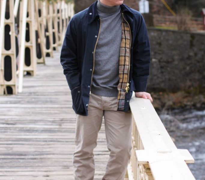 With the slight wind that day, this Fashionisto chose to wear his turtleneck for the added warm around the neck. To layer for more cold-weather practicality, he wore his Barbour wax jacket. As the winter chill blew, it reveals the quilted pattern inside the jacket, which his grey turtleneck perfectly complimented the grey and yellow colors inside of the jacket. To pull off the look, he chose leather Clark lace-up boots of a classic wingtip design with his khakis tucked in. The tan leather color adds more color to his outfit that is not just focused on the top.