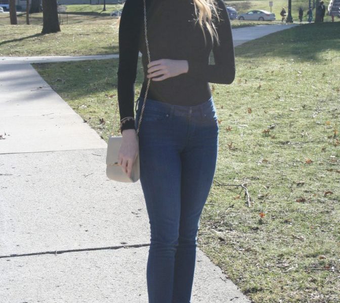 This Fashionista does a great job of collaborating darks and lights. She keeps the outfit simple with a classic black, high-neck sweater. This piece is perfect for bring winter to spring because it is a staple item that many people have and can work in almost any season. The jeans are a medium wash that serves as the middle ground between the dark and light pieces. The lighter elements come into play in her shoes and purse. Her shoes are a taupe, over-the-ankle, high heel boot with a gold metallic heel and zippers. Her purse is a cream shoulder bag with scallop detail and a gold chain strap. These pieces are her statement pieces that bring the two seasons together.