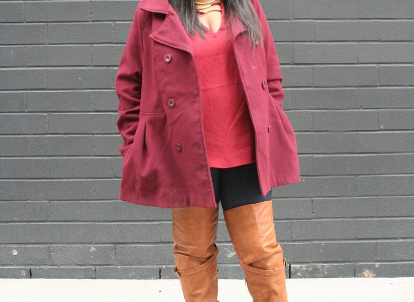While on the town, this Fashionista chose to dress up a pair of dark jeans. She paired it with a blouse that had gold accents around the neck, a black blazer for a more chic and dressier look, and thigh-high boots for some edge and extra warmth. As for her coat, she kept it simple and lightweight with a cute peacoat that matched her blouse and tied her whole look together. With the way this Fashionista put this look together, it was great for staying cute, staying warm, and staying comfortable.