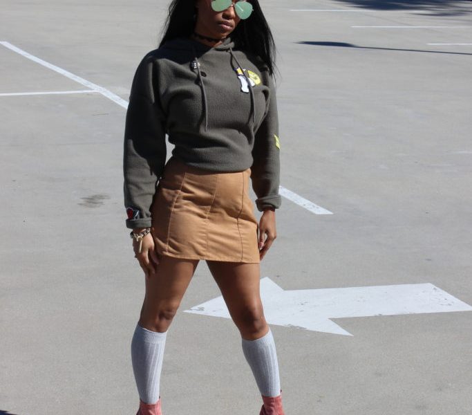 Our style cadet is wearing an Altar’d State hoodie with patches showing her rank in fashion with messages from a simple “P” to a rose on the sleeve. Our cadet also is wearing a brown suede mini skirt from Forever 21 with a mod-influenced design having fun in the sun and taking advantage of the heat. Our cadet also decided to add a pop of color with her pink peep toe booties from Cap Robbins and gray Forever 21 thigh high socks. Along the way, we find a nice lace choker, charm theme bracelet, bar necklace from The Limited and the ultimate military staple fashion item—the aviator glasses.