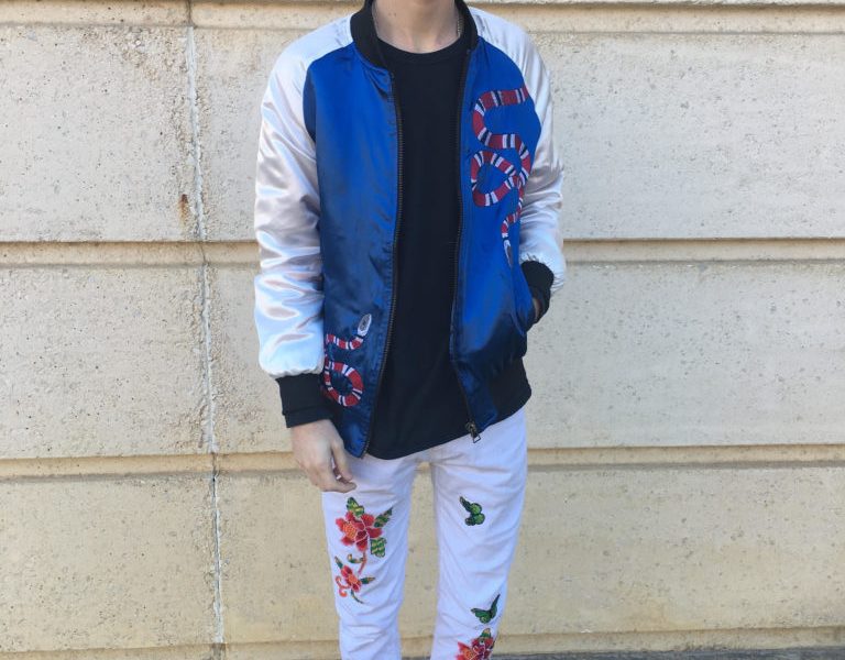 Many trends that have made people rethink their ideals of what people of different genders should wear. Some of these trends, such as men wearing dresses, have succeeded and some have failed in the mass market. Japanese embroidery is a new trend and concept for men’s fashion that was originally a trend followed by women. The embroidery used in the clothing includes floral stitching, and feminine archetypes such as butterflies, small birds and other animals. This Fashionisto has defied all stereotypes and gender norms with the embroidery trend on every piece of his outfit.  The embroidered bomber jacket that is worn by this Fashionisto has the very detailed stitching with a snake wrapped around the jacket. This jacket is a standout with any thing that is worn with it. The jacket wasn’t enough for this creative. He also added even more embroidery details to his ensemble with  a floral and butterfly embroidered denim jeans.  The Japanese embroidery is not the only feminine touch that was brought to  mind with ensemble, it was also the colors that were included into the garment’s embroidery details.
