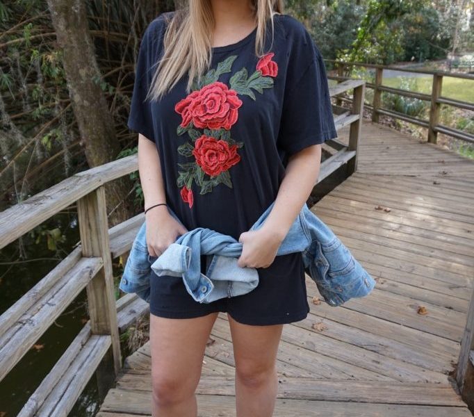 This Fashionista is wearing the perfect look to combat the the roller coaster that is a day in Florida. The look is casual and comfortable, but still incorporates her bold style. Her distressed T-shirt dress with floral embroidery gives an edgy twist to a simple look. The length and lightweight material will keep her feeling and looking cool when the sun starts to shine. Denim jackets have been a favorite recent trend of mine. Her oversize denim jacket pairs perfectly with her T-shirt dress, and will keep her warm when the temperature dips. There are many ways to wear the denim jacket without having to worry about overheating—try tying it around your waist or draping around your shoulders. Her lace-up booties make the look fun and put together all at the same time.