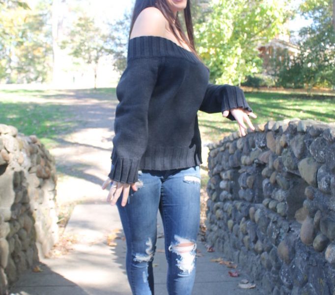 In this look this Fashionista rocks a dark black sweater. I like this sweater because it’s thick enough to keep you warm, yet it shows a little skin. Rebels are fearless. Rebels would never slip on a pair of jeans that didn’t have a little scruff on them. This Fashionista rocks ripped jeans that keep up her persona.