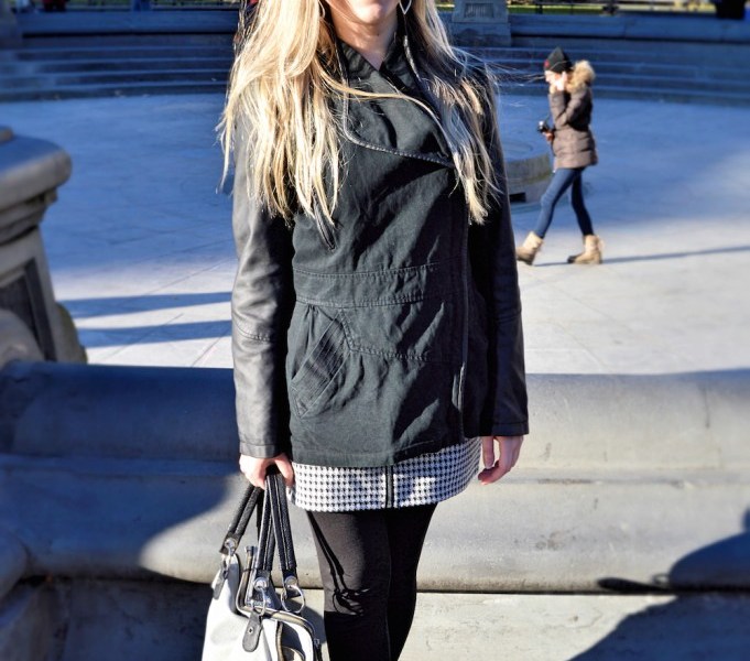 Once inside, her outfit still follows the varying textures rule. Her black and white houndstooth skirt adds some pattern and texture to the rest of her outfit while still flowing with the monochromatic vibe. Her cute booties not only add winter feelings, but they also add some texture with the wool rims and lace-up shoe strings. Although her top, leggings and boots remain all-black, each one varies slightly in its shade of black or has something subtle in the detailing that adds a bit of “oomph” to the look.
