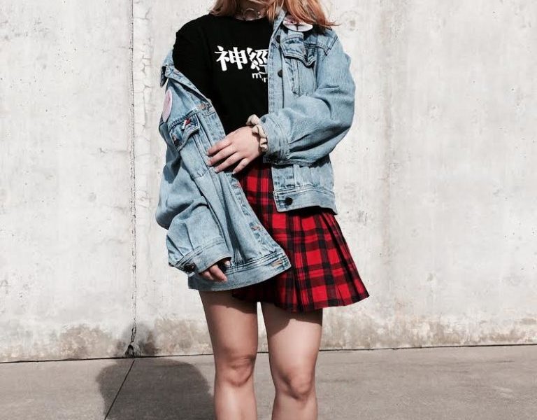 The 1990s were infamous for trends such as choker necklaces, Doc Martens, flannel, denim jackets, and slip dresses. Although these garments may have been in hibernation for a while, they have definitely been making a comeback in recent years. This Fashionista was spotted on campus looking effortlessly grunge, a classic characteristic of 1990s fashion. She was wearing a pleated plaid skirt, graphic t-shirt, and a denim jacket covered in pins and patches. To complete her outfit, she added a pair of white slip-on Vans sneakers, a clear choker and a black leather belt. Her look screams classic 1990s fashion while still looking very modern.