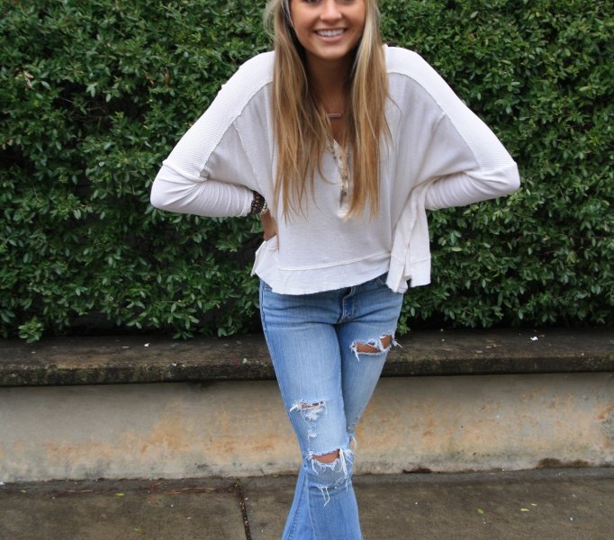 I spotted this Fashionista and was immediately in awe of the coolness in this outfit. She is wearing a pair of light wash flare jeans with distressed detailing on the thighs and knees. She pairs them with a loose, cropped T-shirt that hits perfectly at the top of the jeans. This is a simple way to draw attention to your jeans and make sure you don’t loose any of their style by covering them up. She finishes her look with a stack of beaded bracelets and layers of long, delicate necklaces.
