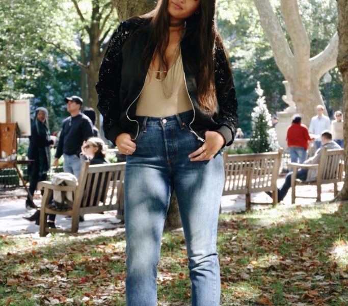 The outfit is kept simple with a neutral body suit, black bomber and a pair of vintage Levi’s. But this Fashionista’s ensemble is totally complemented by the details that bring it to life. The sequin patch gives this look edgy flair. I also adore the Jeffrey Campbell suede western booties as a staple shoe to wear to class, to work or to a night out.