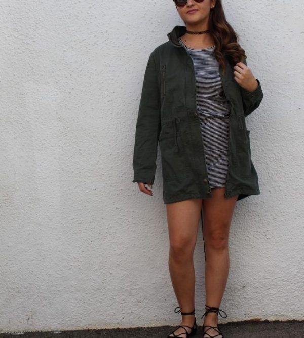 Our Fashionista paired it with a black and white T-shirt dress, lace-up flats, oh so ’90s choker and summer shades. The look is cool, simple and versatile for almost any occasion. Military green is a great way to add in the hues of fall without closely resembling a pumpkin.