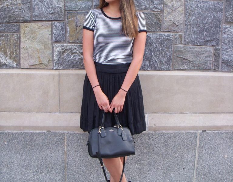 As we Fashionista/os start to make the transition from summer to fall, it’s important to understand and know what can help to make the transition easy. This Fashionista perfectly embodies how to make the transition from summer to fall so simple. The first key is sticking with classic colors that are apparent in every season, such as black and white. Black and white are timeless colors that represent something different depending on the season we are in. For example, in this look black and white demonstrate a simple yet sophisticated summertime look. The simple striped T-shirt paired with the pleated skirt add sophistication to the outfit. Another key part of this outfit is the length of the clothing used in the outfit. This Fashionista used a longer pleated black skirt that is an appropriate choice for both seasons and also adds sophistication to the outfit.