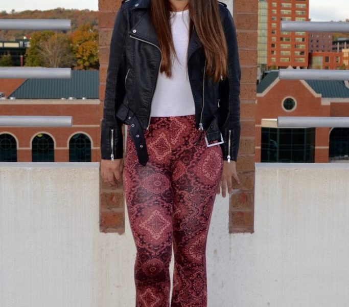 October has come and gone and for the most part, so has the warm weather. With that being said, it’s time to say goodbye to bare shoulders and find new ways to spice up your fall wardrobe. The moto jacket continues to be a staple piece because it’s so versatile but also has the ability to complete a look. This Fashionista mixed up her moto jacket with a bohemian patterned flared pant, white bodysuit, choker and booties.