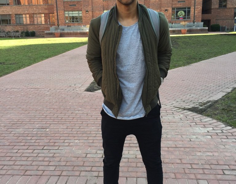 This Fashionisto caught my eye because of his color scheme. Olive green, black and gray are the perfect colors to transition from winter to spring. Olive green and gray are great transitional colors, whereas, the black is classic and can be worn in any season. When I saw this outfit, especially his bomber jacket, I couldn’t help but think of the Balmain collection from last season. Kanye West and Kim Kardashian have sported this bomber jacket trend for a while now. A bomber jacket is the perfect spring jacket as it isn’t too heavy, yet still helps to keep you warm on the windy spring days.