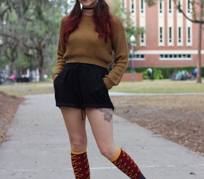 What caught my eye with this Fashionista was her Harry Potter socks. I could see them from all the way across the plaza, and I dashed over to her as if I was riding a Firebolt of my own. Harry Potter always reminds me of Christmas, and as we delve into magical December and its holidays, this Fashionista kicked off this month for me in just the right way. Paired with her flashy socks were well worn combat boots that I could tell perfectly fit her feet. It may have taken a while for her to get them that way, but she has worn them just enough to achieve maximum comfort. Drawstring black shorts and a mustard knitted sweater top off her look of coziness. The dyed red tips of her hair and golden sweater are even Gryffindor house colors, in case you were wondering. Perhaps J.K. Rowling always meant to start a fashion trend.