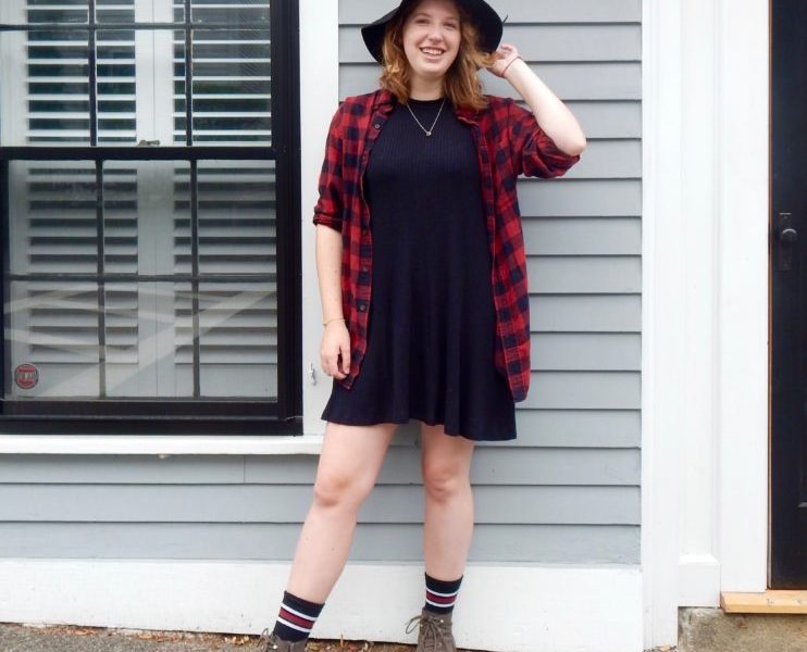 In the outfit above, she perfectly pairs a comfortable black cotton tank dress and a warm red flannel to prepare for the fluctuating summer/fall temperature. The felt hat is perfect for fall, not to mention a great solution for those eight AM classes you dread fixing your hair for. Score! Continuing with a grunge theme that would make Kurt Cobain proud, she laced up some light cognac combat boots with fun matching socks making for walk class. Completing the look in a different direction, this girl sports some beautiful dainty jewelry and a #RAD Great Gatsby tote to create an overall hip, feminine ensemble.