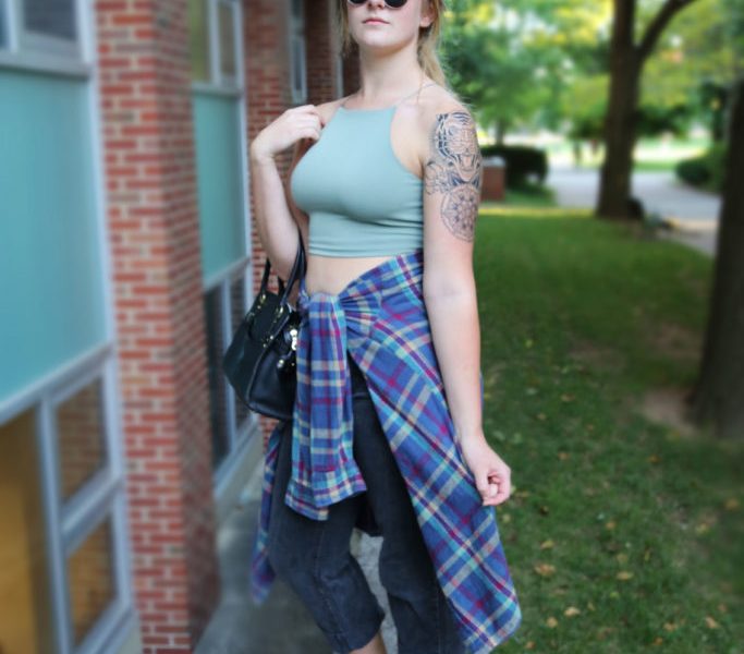 My absolute favorite part about this look is the flannel around the waist. This Fashionista lucked out when she scored this flannel at the thrift store. Find a flannel that has multiple of your favorite colors so it’s easier to match with the rest of your wardrobe! Speaking of, this Fashionista has found the perfect minimalist crop top to go with her checkered statement piece.
