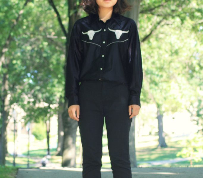 This Fashionista totally modified the western trend and nailed it. Her ensemble is all black and bad-to-the-bone. The key piece of this outfit is a silky, button-down blouse adorned with two bull skulls. It’s unique and definitely makes a statement. She pairs the blouse with black cigarette trousers. She tops off the look with another key trend, all-white adidas sneakers. The look is simple but original. She proves you don’t have to go galloping off into the sunset in the deserts of Nevada to be a cool cowgirl.