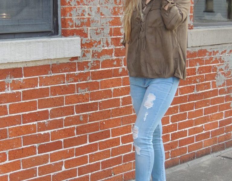 Our Fashionista being featured is showing us just one way to rock both of the trends. Styled in clothes and accessories from Constance Boutique, she starts off her outfit with the basics. She is wearing light wash, distressed denim and a suede shirt with the crisscross detailing. To tie in the choker trend, she is wearing a gold and black choker with a light blue accent. To finish the outfit you could throw on some heeled booties and a hat and you are good to go, just like this Fashionista!