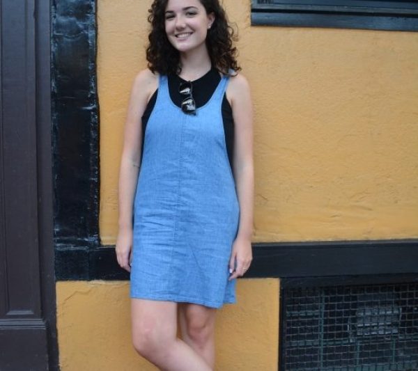 This day was particularly hot for fall, so this Fashionista decided to pair her denim dress with a high-neck tank, some Sperry’s and trendy sunglasses to block out that Indian summer sun. This outfit is perfect for staying cool and cute at the same time. However, this outfit could easily be altered for a cooler day by wearing a long sleeve top, adorable scarf and booties. This denim piece truly shows how versatile denim is.