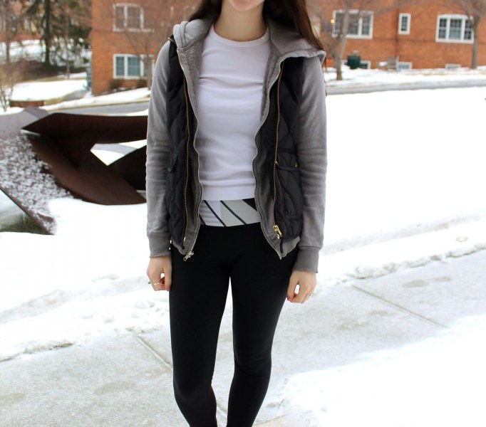 This Fashionista’s workout/class gear would make any college girl jealous. It’s not just super cozy looking; it’s also really fun with lots of different things going on. Her lululemon leggings might just look like a regular old black pair, but the geometric detailing on the waistband gives them some personality. Paired with a plain white T-shirt, your eyes are drawn to the pattern on them.