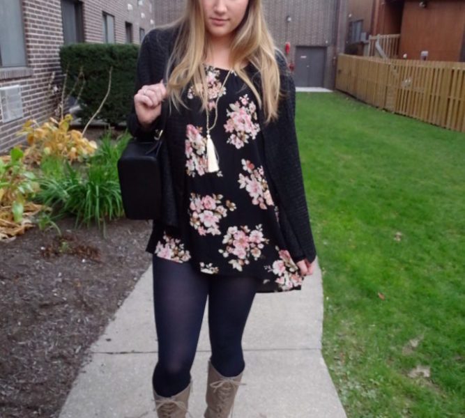 This Fashionista took the layering advice and created a super cute and functional outfit. Her black and floral dress matches perfectly with the black, knit cardigan. She paired the dress and cardigan with knee-high, lace-up boots. As for accessories, she added a long, tassel necklace and a small, black backpack. All together the look is perfectly layered, and incorporates dark colors with a little pink accent that fits in with the current season.