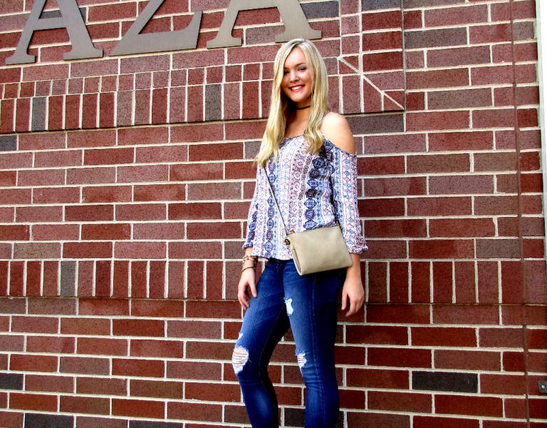 Overall, the outfit is easy, breezy and bohemian. It is a great look for shopping, going to class, grabbing lunch, or running errands. My advice this week is to be comfortable in what you are wearing but be sure to add some detail pieces to make your outfit more unique. The choker, bracelets, distressed jeans, open shoulder top and cutout heels are tiny little details that when put together makes a huge difference in the overall appearance of the outfit.