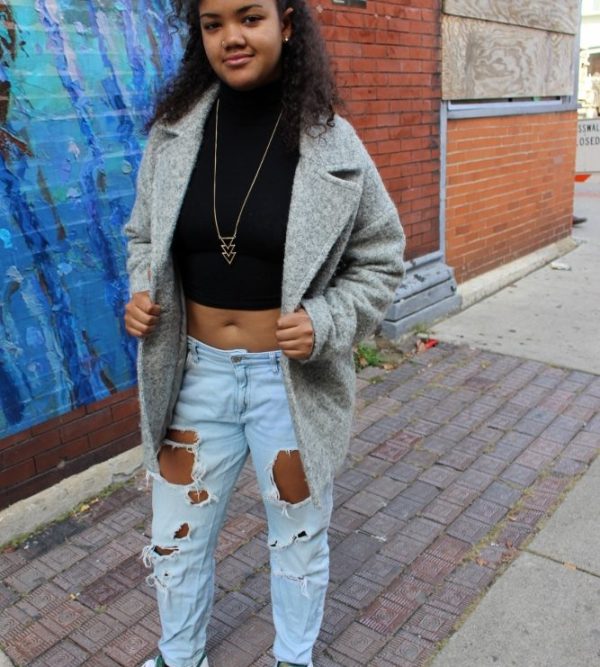 This is where layering reaches its peak necessity. At 30 degrees in the morning and 70 degrees by 2 p.m., you’re going to need that coat and tank combo. A chunky peacoat gives a sense of balance in this outfit, providing bulk where its lost in the crop top. This light grey coat is super daytime friendly, while also easily dressed up or down. Accessories  can always make or break an outfit, and I’d suggest stacking every delicate necklace and bracelet you own to jazz up patternless pieces.