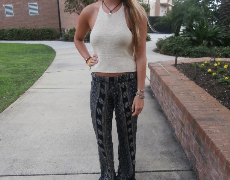 This Fashionista captures the perfect essence of that comfy, beachy vibe that I love in the way she styles her favorite pair of fun pants. The print is nothing too obnoxious so they’re perfect for just a casual dinner on campus, class or even a study date with the cute Fashionisto down the hall. The crochet in the top is also so unique that it balances the calm print of the pants perfectly. Plus, how comfortable does that look? The halter neckline is super trendy right now, especially with the loose choker necklace just grazing the neckline. The stacks of bracelets of all different colors and materials are the perfect accessories, not drawing too much attention away from the pants.