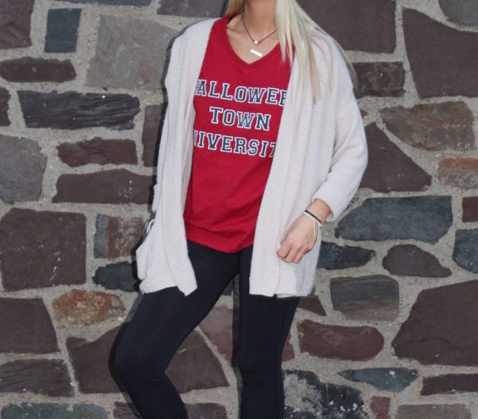 “Sweater weather” has arrived at last. This week’s style advice is to throw on a comfortable sweater! Since the weather usually becomes a little colder in October, a sweater is the perfect clothing item to add to an outfit. It is simple, yet keeps the outfit cute, comfortable and warm. This Fashionista decided to wear a shirt that says “Halloween Town University,” which she paired with a plain-colored sweater. This T-shirt can be homemade. You can buy a plain T-shirt and iron-on letters—a creative project for the Halloween season. This f shirt is original and expressive, and a fun way to show off your Halloween spirit.