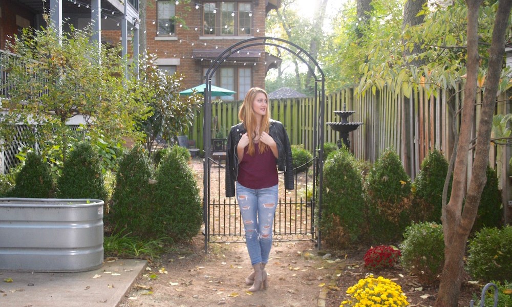 Today our lovely fashion superstar is pairing a maroon slip top with an edgy leather jacket, paired with distressed denim and tight ankle boots. I think the color of the top is perfect for fall. Maroon and mauves are my favorite fall colors because they’re so warm and can be paired with pretty much anything in your closet. Leather jackets are also a fall fashion staple, they give even the prettiest outfit a dose of edge. My favorite part of this outfit are THOSE BOOTS. I could go on for days about them, they’re fantastic. They have the coolness factor of the Yeezy Season 2 boots, just, ya know, hundreds of dollars cheaper. They are also so versatile, and can be worn with pants or a dress, sweats or a slip, and you’ll still look like a rockstar.
